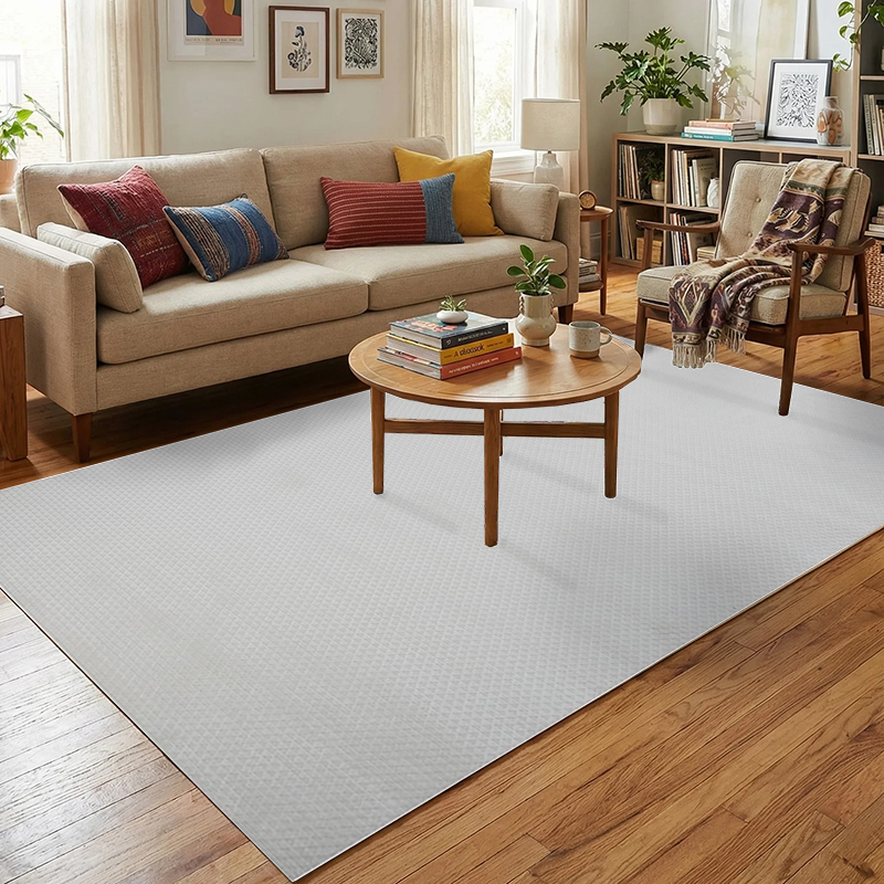 This Rug is composed of 100% Polyester, providing a soft feel while maintaining durability. Its neutral tone and modern design make it suitable for various interior styles.