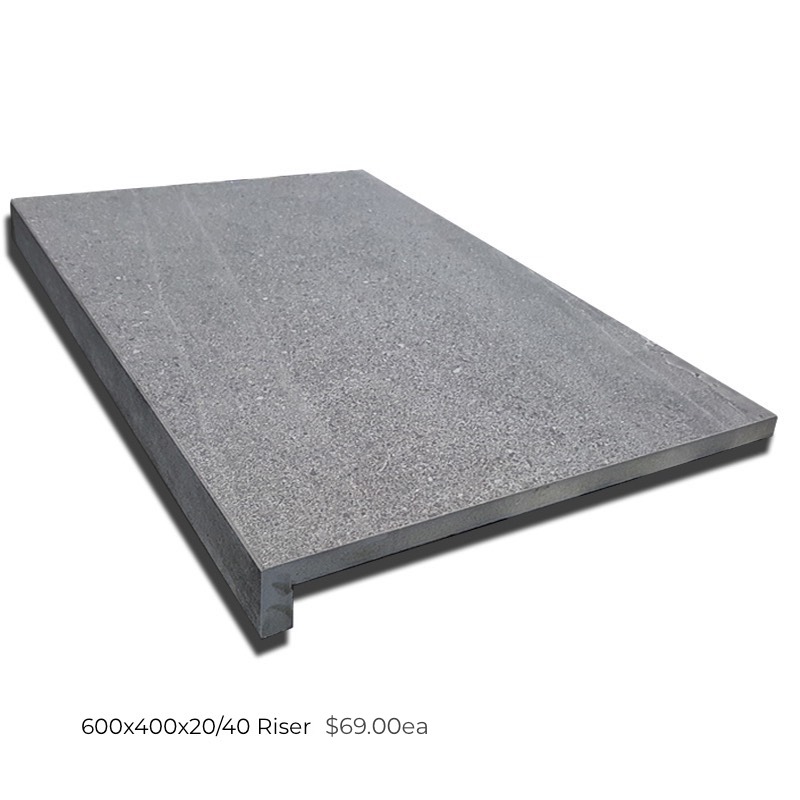 Quartz Porcelain paver range has the earthy look of real stone slabs in three natural greys with slip resistant textured finish for stairs and pools with matching drop down copers.